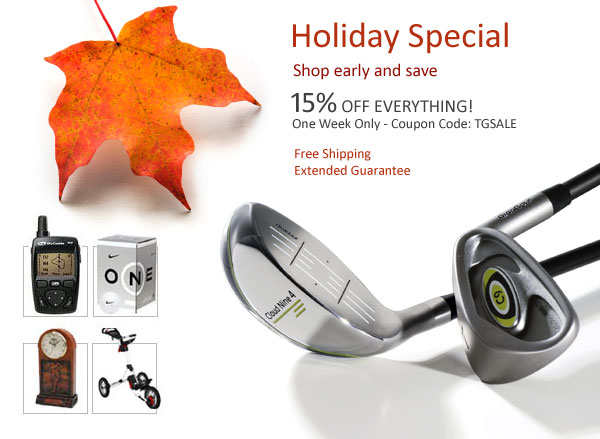 | *Offer valid 11/19/2007-12/4/2007. Offer only valid on purchases made online at www.GigaGolf.com or phone orders at 1-800-724-3085. Coupon code must be entered at time of purchase. Offer does not apply to special orders, prior purchases or gift certificates. Offer is limited to stock and colors on hand and is not transferable or redeemable for cash. Offer may not be combined with any other discount or offer. Offer is intended solely for your personal use and may not be shared or distributed in any form. Copyright © 2007 GigaGolf, Inc. All rights reserved. |